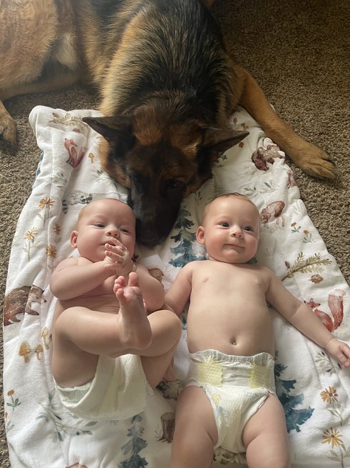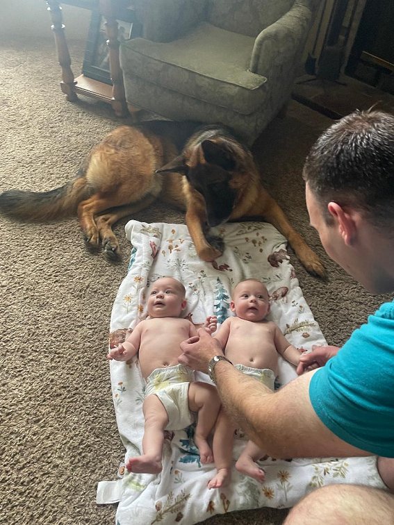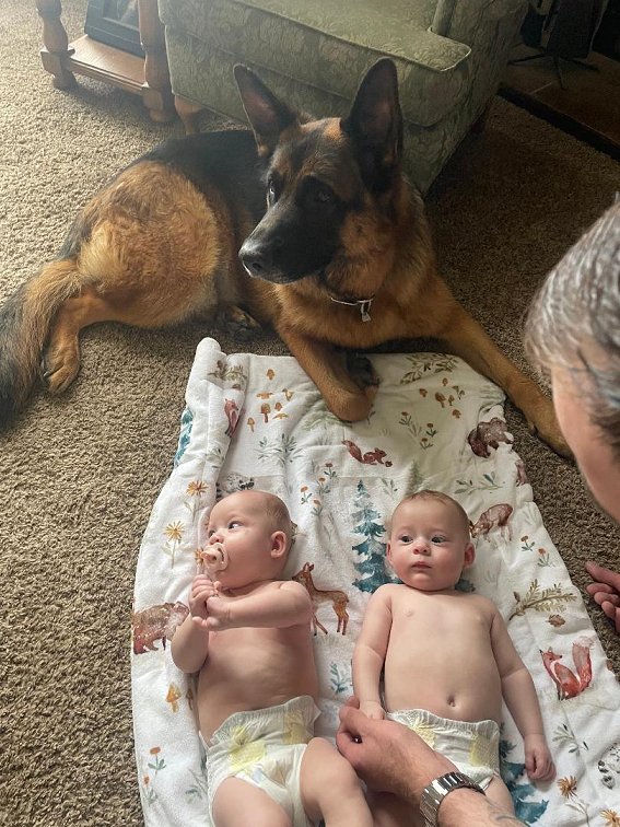 I just wanted to share these photos. These are two 5-month old twin babies. Len is very sweet with them and protective of them. I trust Len around children and babies more than any other dog I know of or have ever met. He truly is the best dog in the world. Thanks to FLEISCHERHEIM….